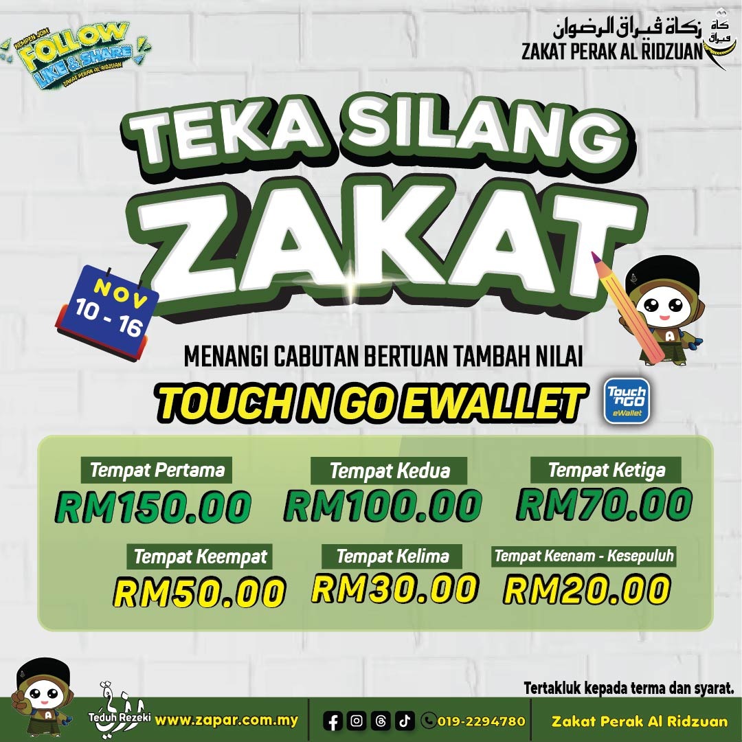 - KLIK DISINI untuk melihat terma dan syarat penuh Kempen Follow, Like & Share #Interaktif Zakat: Kuiz, Silang Kata & Spot & Menang!